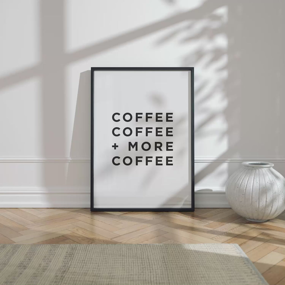 Perfect for true coffee lovers, this "Coffee Coffee More Coffee" poster captures the spirit of caffeine enthusiasm with bold typography and a minimalist design. Printed on high-quality paper for a crisp and vibrant look, it’s a fun and stylish addition to any kitchen, coffee bar, or office space. Ideal for those who can’t get enough of their favorite brew, this poster makes a great gift for friends and family who share a passion for coffee.