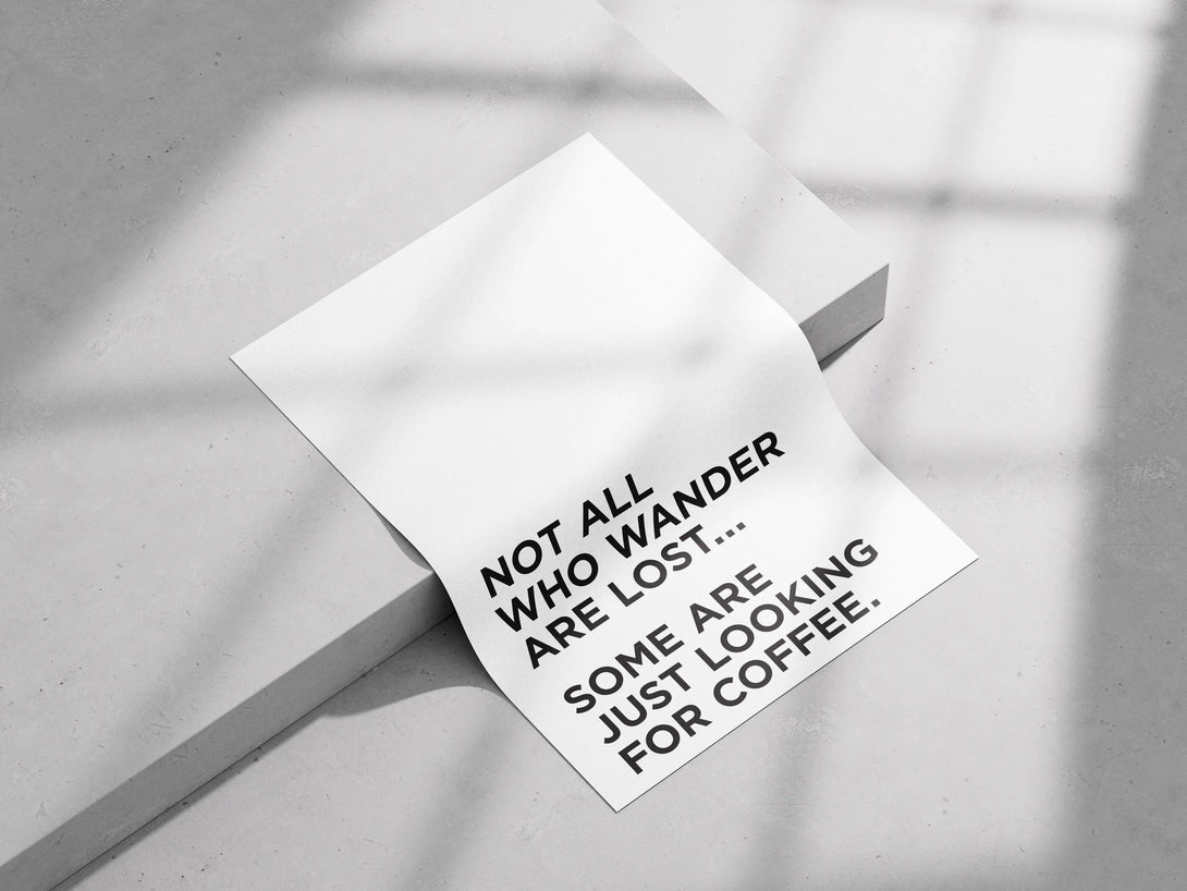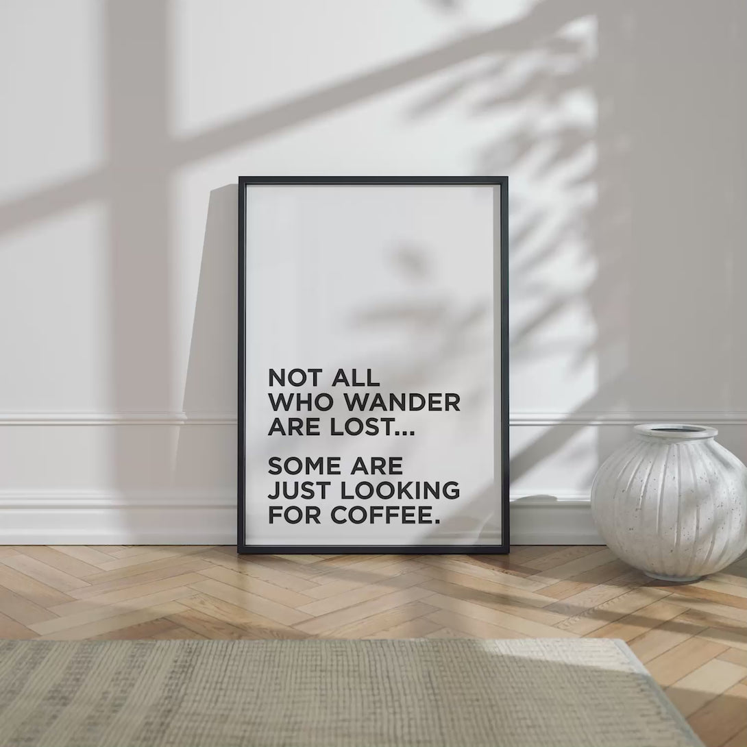 Perfect for those whose adventures often lead to the nearest coffee spot, this playful poster adds charm and humor to your space. The witty quote, “Not All Who Wander Are Lost, Some Are Just Looking for Coffee” is ideal for coffee-loving explorers and brings a lighthearted touch to kitchens, coffee nooks, or workspaces. Embrace your love for caffeine and wandering spirit with this charming decor piece!